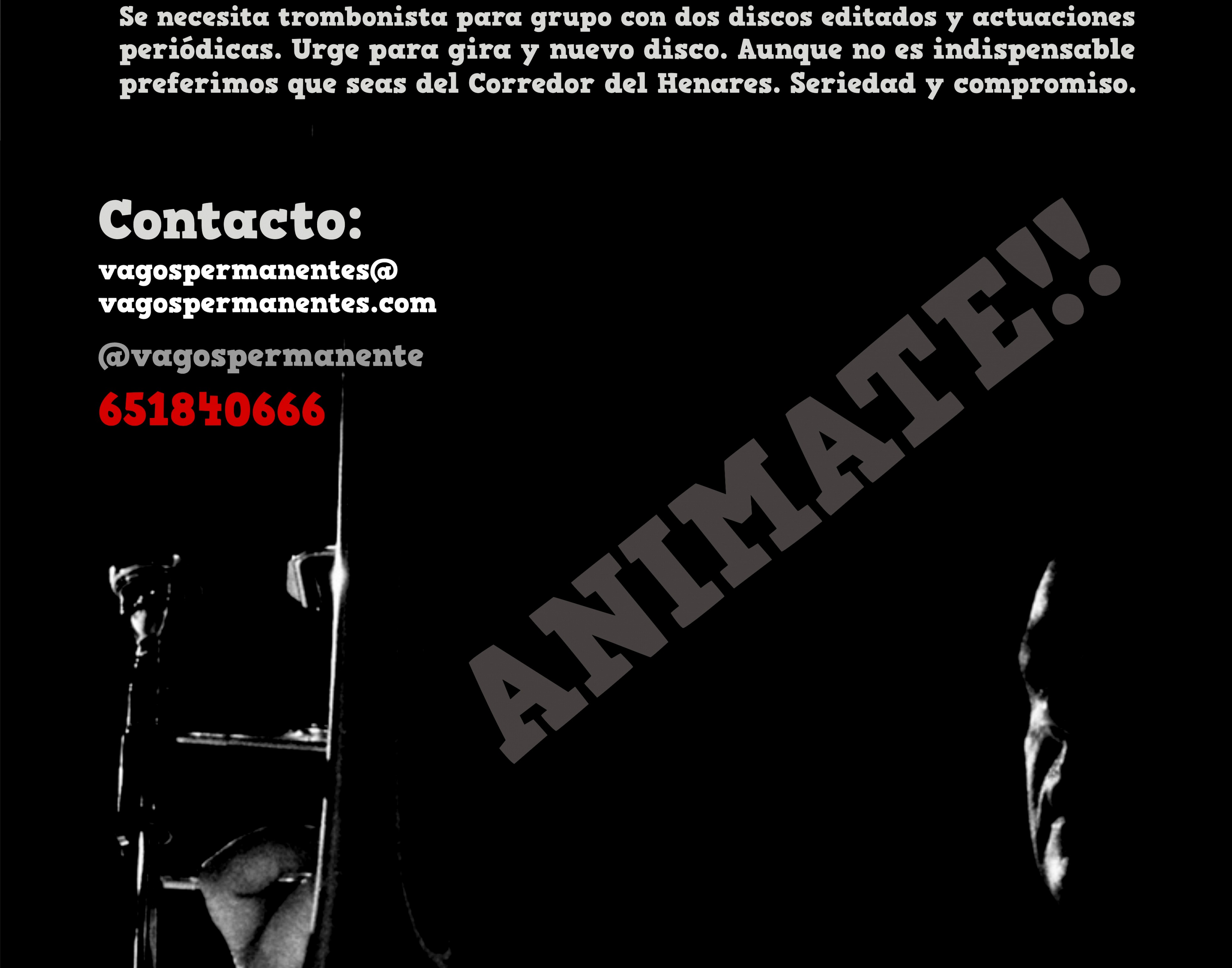 Buscamos una persona, que sea del corredor del henares o cerca del mismo. Preferiblemente que le guste el ska-punk y Vagos Permanentes con ganas de involucrarse en el grupo.